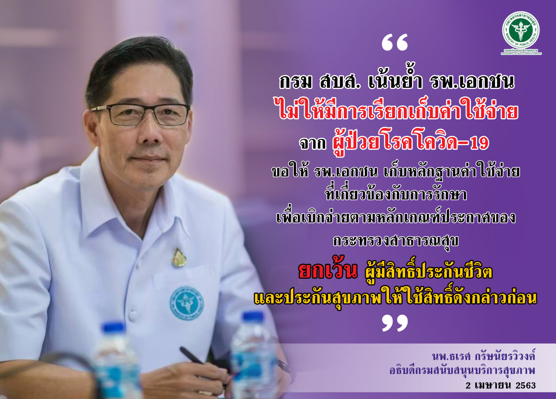 นายแพทย์ธเรศ กรัษนัยรวิวงค์ อธิบดีกรมสนับสนุนบริการสุขภาพ (กรม สบส.) กล่าวว่า ที่ประชุมศูนย์ปฏิบัติการฉุกเฉินด้านการแพทย์และสาธารณสุข กระทรวงสาธารณสุข จึงได้ร่วมพิจารณาประเด็นการรักษาพยาบาลของผู้ป่วยโรคโควิด-19 และได้กำหนดหลักการจ่ายค่าใช้จ่ายในการรับบริการจากสถานพยาบาลเอกชนขึ้น เพื่อช่วยบรรเทาความเดือดร้อนของประชาชนในการรักษาพยาบาล ซึ่งกรม สบส.ได้ดำเนินการจัดส่งหนังสือแจ้งหลักการจ่ายค่าใช้จ่ายของสถานพยาบาลเอกชนกรณีการรักษาพยาบาลผู้ป่วยโรคโรคโควิด-19 ถึงสถานพยาบาลเอกชนทั่วประเทศแล้ว แต่ยังพบการร้องเรียนว่าโรงพยาบาลเอกชนบางแห่งยังเรียกเก็บค่ารักษา จึงขอย้ำขอให้โรงพยาบาลเอกชนทุกแห่งให้การรักษาพยาบาลผู้ป่วยอย่างเต็มความสามารถโดยไม่เอาค่าใช้จ่ายมาเป็นเงื่อนไข ห้ามเรียกเก็บค่ารักษาพยาบาลจากผู้ป่วยหรือญาติโดยเด็ดขาด และให้จัดเก็บเอกสารหลักฐานค่าใช้จ่ายที่เกี่ยวข้องกับการรักษาพยาบาลของผู้ป่วย เพื่อนำมาประกอบการเบิกจ่ายตามหลักเกณฑ์ที่กระทรวงสาธารณสุขประกาศ ซึ่งผ่านความเห็นชอบของ ครม. ในเบื้องต้นแล้ว และจะมีการประกาศใช้ในเร็ว ๆ นี้ ยกเว้นกรณีผู้ที่มีประกันชีวิต หรือประกันสุขภาพให้ใช้สิทธิดังกล่าวก่อน
