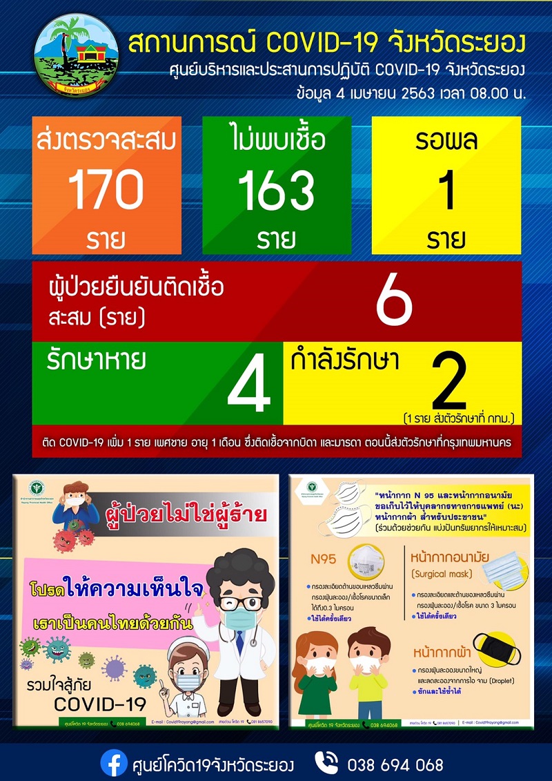 ด้าน นพ.สุนทร เหรียญภูมิการกิจ นายแพทย์สาธารณสุขจังหวัดระยอง แถลงสถานการณ์โรคติดต่อเชื้อไวรัสโคโรนา 2019 หรือโควิด-19 ว่า จังหวัดระยอง ตรวจพบผู้ป่วยยืนยันติดเชื้อแล้ว 6 ราย รักษาหายกลับบ้านแล้ว 4 ราย กำลังรักษาตัว 2 ราย ส่วนผู้ป่วยรายล่าสุดเป็นทารกวัย 1 เดือน ติดมาจากพ่อและแม่ที่ทำงานอยู่กรุงเทพฯ ซึ่งพ่อและแม่เด็กมีไข้จึงไปตรวจจนพบเชื้อ ปัจจุบันพักรักษาตัวอยู่ที่สถาบันบำราศนราดูร ขณะรักษาตัวได้แจ้งให้ตา (ดาบตำรวจ) กับยายของเด็กที่อยู่จังหวัดระยองมารับเด็กไปดูแลที่ระยอง ต่อมาพบว่าเด็กมีไข้ ตัวร้อน ตาและยายจึงพาไปตรวจที่โรงพยาบาลบ้านฉาง ผลตรวจยืนยันออกมาวานนี้ (3 เม.ย.) พบว่าเชื้อโควิด-19 เช่นเดียวกับพ่อแม่ ขณะนี้ได้ส่งตัวเด็กไปรักษาที่สถาบันบำราศนราดูร