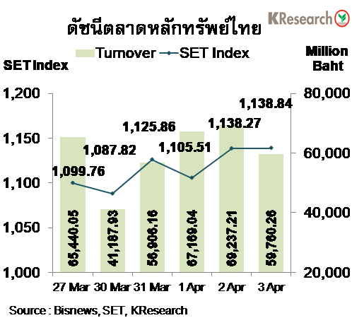 ปิดที่ระดับ 1,138.84 จุด เพิ่มขึ้น 3.55% จากสัปดาห์ก่อน ขณะที่มูลค่าการซื้อขายเฉลี่ยต่อวันอยู่ที่