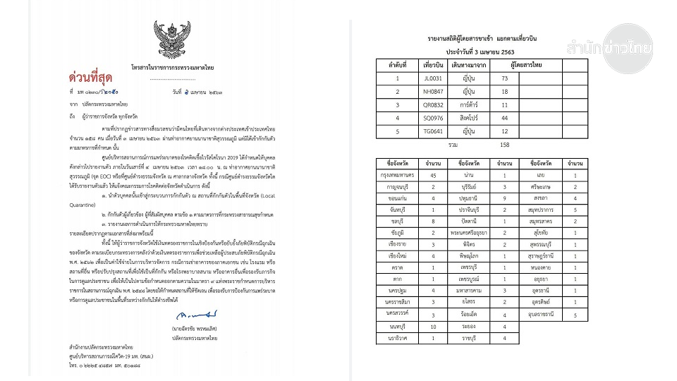 นายฉัตรชัย พรหมเลิศ ปลัดกระทรวงมหาดไทย ออกหนังสือด่วนถึงผู้ว่าราชการทุกจังหวัด แจ้งมาตรการดำเนินการ หลังคนไทยที่เดินทางกลับจากต่างประเทศ เข้าประเทศไทย เมื่อวันที่ 3 เม.ย.63 จำนวน 158 คน ผ่านท่าอากาศยานสุวรรณภูมิ แต่ไม่ยอมเข้าสู่กระบวนการกักตัวในสถานที่ที่รัฐจัดให้ ซึ่งศูนย์บริหารสถานการณ์การแพร่ระบาดของโรคติดเชื้อไวรัสโคโรนา 2019 (โควิด-19) หรือ ศบค. เข้ารายงานตัว ที่ ศูนย์ปฏิบัติการฉุกเฉิน ท่าอากาศยานสุวรรณภูมิ หรือ ศูนย์ดำรงธรรมจังหวัด ที่ศาลากลางจังหวัด ภายในเวลา 18.00 น. วันนี้ (4 เม.ย.) ตามที่ ศบค.กำหนด
