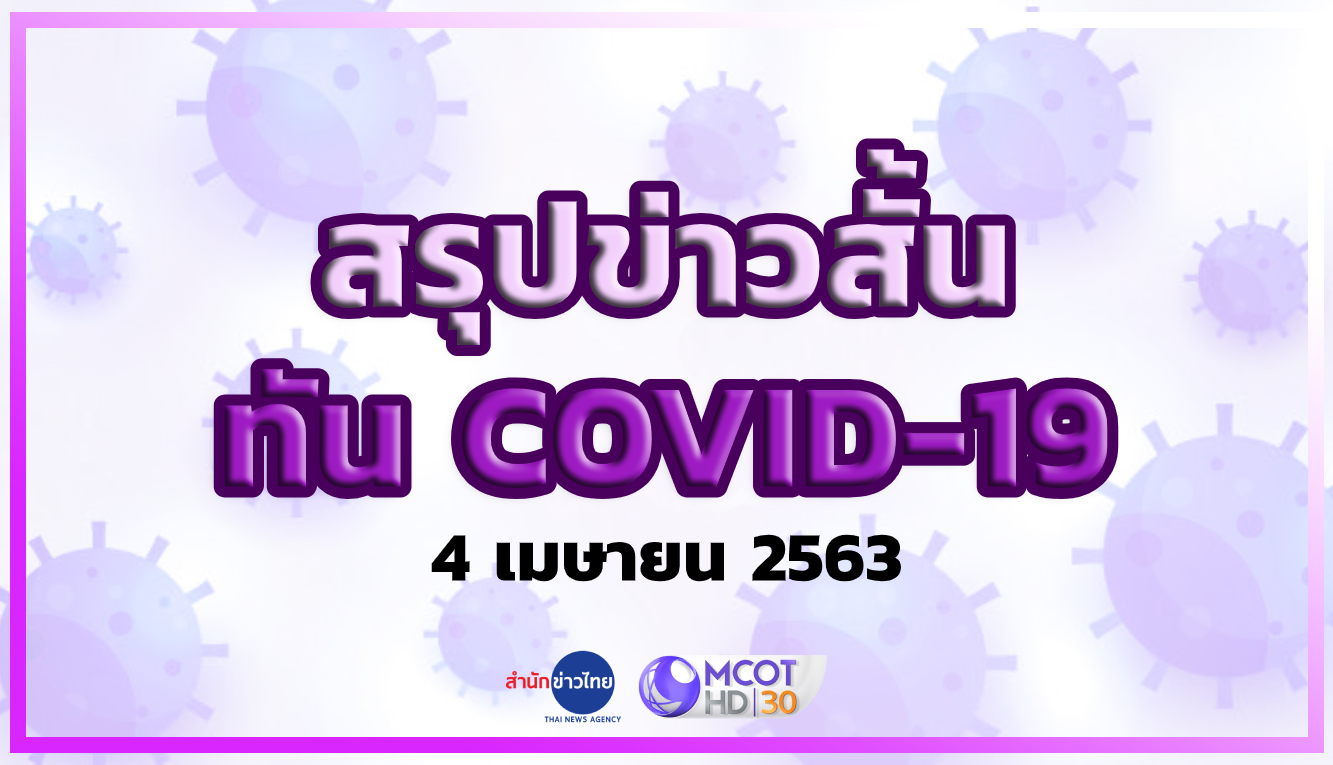 สำนักข่าวไทย 4 เม.ย. 63 – อัปเดตสถานการณ์โควิด-19 ประจำวันที่ 4 เม.ย. 63 กับสรุปข่าวสั้น ทันโควิด-19 ไทยมี 13 จังหวัดยังไม่ติดเชื้อ, หายป่วยแล้ว 612 ตายเพิ่มอีก 1