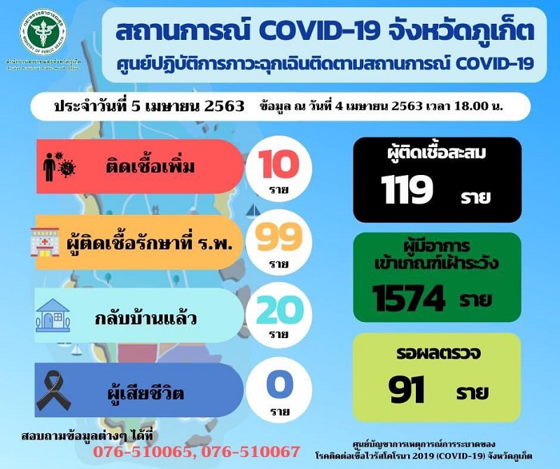 คณะกรรมการโรคติดต่อจังหวัดภูเก็ต รายงานสถานการณ์ผู้ติดเชื้อไวรัสโควิด-19 ระหว่างวันที่ 5 ม.ค.-4 เม.ย.2563 ล่าสุดพบผู้ป่วยรายใหม่ 10 ราย รวมผู้ป่วยยืนยันสะสม 119 ราย ในจำนวนนี้รักษาหายกลับบ้านแล้ว 20 ราย รักษาพยาบาลอยู่ 99 ราย อาการรุนแรง 1 ราย ที่เหลืออาการอยู่ในเกณฑ์ดี รอผลตรวจยืนยันทางห้องปฏิบัติการ อีก 91 ราย