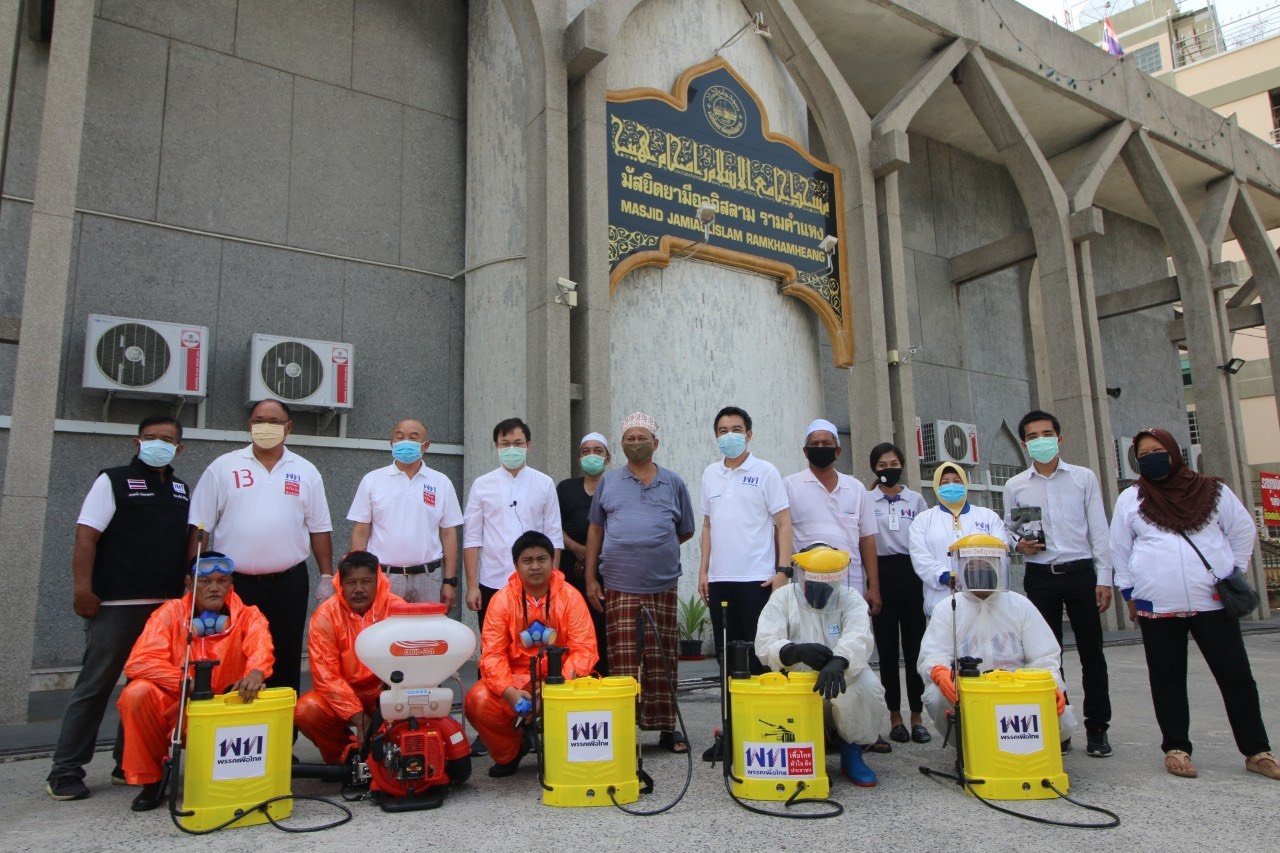 กทม. 6 เม.ย. – นายประเดิมชัย บุญช่วยเหลือ ส.ส. กทม. พรรคเพื่อไทยพร้อมด้วยนายประพนธ์ เนตรรังษี ส.ก.เขตจตุจักร พรรคเพื่อไทย และนายตรีรัตน์ ศิริจันทโรภาส เลขานุการประจำคณะกรรมาธิการป้องกันและปราบปรามการทุจริตประพฤติมิชอบ สภาผู้แทนราษฎร และอดีตผู้สมัคร ส.ส. กรุงเทพฯ พรรคเพื่อไทย หรือทีม 3 ป.เพื่อไทย ร่วมกิจกรรมบิ๊กคลีนนิ่งฉีดพ่นฆ่าเชื้อกำจัดโควิด-19 บริเวณมัสยิดยามิอุ้ลอิสลาม (รามคำแหง53)และท่าเรือคลองแสนแสบ (สถานี ม.รามคำแหง)