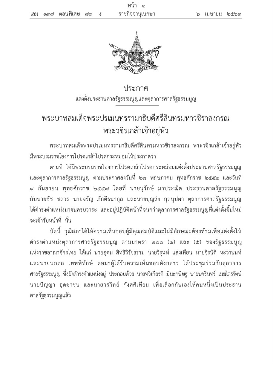 ผู้สื่อข่าวรายงานว่า เว็บไซต์ราชกิจจานุเบกษา เผยแพร่ประกาศแต่งตั้งประธานศาลรัฐธรรมนูญและตุลาการศาลรัฐธรรมนูญ ความว่าพระบาทสมเด็จพระปรเมนทรรามาธิบดีศรีสินทรมหาวชิราลงกรณพระวชิรเกล้าเจ้าอยู่หัว มีพระบรมราชโองการโปรดเกล้าโปรดกระหม่อมให้ประกาศว่า ตามที่ ได้มีพระบรมราชโองการโปรดเกล้าโปรดกระหม่อมแต่งตั้งประธานศาลรัฐธรรมนูญ และตุลาการศาลรัฐธรรมนูญ ตามประกาศลงวันที่ 28 พ.ค.2551 และวันที่ 9 พ.ค.2557 โดยที่ นายนุรักษ์ มาประณีต ประธานศาลรัฐธรรมนูญ กับนายชัช ชลวร นายจรัญ ภักดีธนากุล และนายบุญส่ง กุลบุปผา ตุลาการศาลรัฐธรรมนูญได้ดำรงตำแหน่งมาจนครบวาระ และอยู่ปฏิบัติหน้าที่จนกว่าตุลาการศาลรัฐธรรมนูญที่แต่งตั้งขึ้นใหม่จะเข้ารับหน้าที่