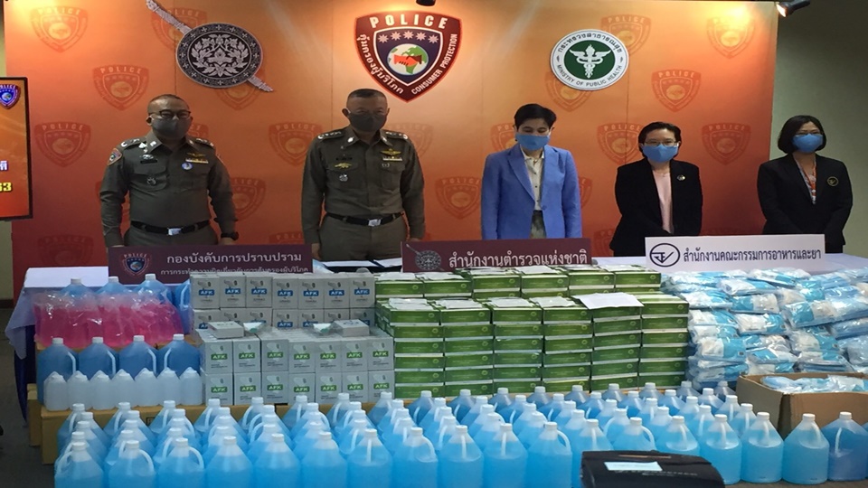 พลตำรวจโทเพิ่มพูน ชิดชอบ ผู้ช่วยผู้บัญชาการตำรวจแห่งชาติ ในฐานะหัวหน้าคณะทำงานฯ พร้อม ตำรวจกองบังคับการปราบปรามการกระทำความผิดเกี่ยวกับการคุ้มครองผู้บริโภค หรือ ปคบ. และ อย. แถลงผลการจับกุมผู้กักตุนหน้ากากอนามัย และขายเกินราคา รวมทั้งลักลอบนำชุดตรวจโควิด-19 และเจลผสมแอลกอฮอล์มาจำหน่ายโดยไม่ได้รับอนุญาตในพื้นที่กรุงเทพมหานครและปริมณฑล ระหว่างวันที่ 22 มีนาคม – 2 เมษายนที่ผ่านมา สามารถจับกุมได้ทั้งสิ้น 5 คดี ยึดของกลางชุดตรวจโรคโควิด-19 จำนวน 55,000 ชุด, หน้ากากอนามัย 350,000 ชิ้น, เครื่องวัดอุณหภูมิ แบบอินฟราเรด 1,200 เครื่อง, ผลิตภัณฑ์แอลกอฮอล์ 53,000 ลิตร และ เจลผสมแอลกอฮอล์ไม่ได้มาตรฐาน 7,896 ชิ้น, ผลิตภัณฑ์เครื่องสำอาง 8,271 ชิ้น รวมมูลค่าของกลางทั้งสิ้นกว่า 50 ล้านบาท
