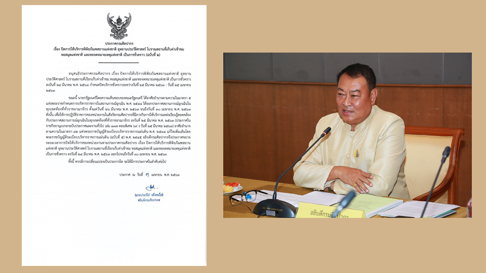 นายประทีป เพ็งตะโก อธิบดีกรมศิลปากร เปิดเผยว่า ตามที่กรมศิลปากรประกาศปิดการให้บริการพิพิธภัณฑสถานแห่งชาติ อุทยานประวัติศาสตร์ โบราณสถานที่เก็บค่าเข้าชม หอสมุดแห่งชาติและหอจดหมายเหตุแห่งชาติ เป็นการชั่วคราว ระหว่างวันที่ 25 มีนาคม – 25 เมษายน 2563 ขณะนี้ นายกรัฐมนตรีโดยความเห็นชอบของคณะรัฐมนตรี ได้อาศัยอำนาจตามความในมาตรา 5 แห่งพระราชกำหนดการบริหารราชการในสถานการณ์ฉุกเฉิน พ.ศ.2548 ได้ออกประกาศสถานการณ์ฉุกเฉินในทุกเขตท้องที่ทั่วราชอาณาจักร ตั้งแต่วันที่ 26 มีนาคม – 30 เมษายน 2563