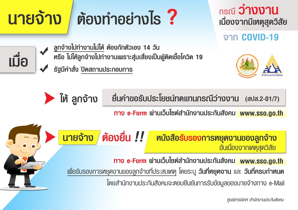 สำนักงานประกันสังคมจะจ่ายสิทธิประโยชน์ทดแทนกรณีว่างงานในอัตราร้อยละ 62 ของค่าจ้างรายวันให้รับตลอดระยะเวลาที่หยุดงาน โดยให้รับไม่เกิน 90 วัน และได้เปิดช่องทางให้บริการขอรับสิทธิประโยชน์ว่างงานเนื่องจากเหตุสุดวิสัยเพื่อรองรับมาตรการดังกล่าวเป็นการเฉพาะ โดยผู้ประกันตนจะต้องยื่นขอรับสิทธิและนายจ้างมีหน้าที่รับรองการหยุดงานของลูกจ้างอันเนื่องจากเหตุสุดวิสัยผ่าน e-form บนหน้าเว็บไซต์ www.sso.go.th ผลปรากฏมีผู้ประกันตนยื่นขอรับสิทธิเป็นจำนวนมาก  แต่ยังขาดนายจ้างรับรองการหยุดงานดังกล่าว