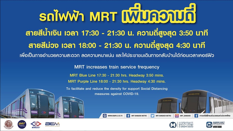 นายภคพงศ์ ศิริกันทรมาศ ผู้ว่าการ การรถไฟฟ้าขนส่งมวลชนแห่งประเทศไทย (รฟม.) เปิดเผยว่า ตามข้อสั่งการของนายกรัฐมนตรีและนายศักดิ์สยาม ชิดชอบ รัฐมนตรีว่าการกระทรวงคมนาคม รฟม. และบริษัท ทางด่วนและรถไฟฟ้ากรุงเทพ จำกัด (มหาชน) หรือ BEM ผู้ให้บริการเดินรถไฟฟ้ามหานคร สายเฉลิมรัชมงคล (MRT สายสีน้ำเงิน) และสายฉลองรัชธรรม (MRT สายสีม่วง) พร้อมปรับเพิ่มขบวนรถไฟฟ้าวิ่งให้บริการประชาชนช่วงก่อนเวลาเคอร์ฟิว 22.00 น. ตั้งแต่วันที่ 7 เมษายน 2563 เป็นต้นไป โดยรถไฟฟ้า MRT สายสีน้ำเงิน จะจัดรถไฟฟ้าจำนวน 42 ขบวน วิ่งให้บริการต่อเนื่องในชั่วโมงเร่งด่วนเย็นจนถึงปิดให้บริการ ระหว่างเวลา 17.30 – 21.30 น. ด้วยความถี่ให้บริการ 3.50 นาทีต่อขบวน และรถไฟฟ้า MRT สายสีม่วง จะจัดรถไฟฟ้าจำนวน 16 ขบวน วิ่งให้บริการต่อเนื่องในชั่วโมงเร่งด่วนเย็นจนถึงปิดให้บริการ ระหว่างเวลา 18.00 – 21.30 น. ด้วยความถี่ให้บริการ 4.30 นาทีต่อขบวน ทั้งนี้ เพื่ออำนวยความสะดวกและลดความหนาแน่นแก่ผู้โดยสาร สามารถเดินทางกลับเข้าเคหสถานได้ก่อนเวลา 22.00 น.