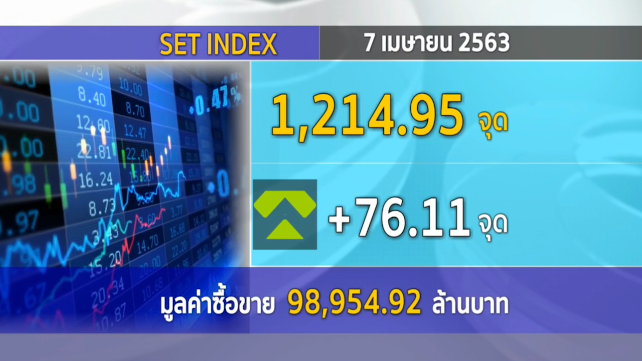 กรุงเทพฯ 7 เม.ย. -ดัชนีตลาดหลักทรัพย์ฯ ปิดวันนี้ (7 เม.ย.) ที่ระดับ 1,214.95 จุด เพิ่มขึ้น 76.11 จุด หรือ 6.68% มูลค่าการซื้อขาย 98,954.92 ล้านบาท ขานรับมาตรการเยียวยาโควิด-19.-สำนักข่าวไทย