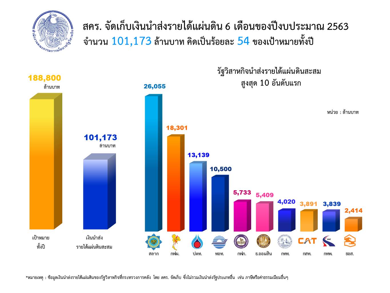 ทั้งนี้รัฐวิสาหกิจที่นำส่งรายได้แผ่นดินสะสมสูงสุด 10 อันดับแรก ณ สิ้นเดือนมีนาคม 2563 นำส่งรายได้แผ่นดิน คิดเป็นร้อยละ 92 ของเงินนำส่งรายได้ทั้งหมด โดยรัฐวิสาหกิจที่นำเงินส่งรายได้แผ่นดิน มาที่สุด คือ สำนักงานสลากกินแบ่งรัฐบาล 26,055 ล้านบาท รองลงมาอันดับที่ 2. การไฟฟ้าฝ่ายผลิตแห่งประเทศไทย 18,301 ล้านบาท 3. บริษัท ปตท. จำกัด (มหาชน) 13,139 ล้านบาท 4. บริษัท ท่าอากาศยานไทย จำกัด (มหาชน) 10,500 ล้านบาท 5. การไฟฟ้าส่วนภูมิภาค 5,733 ล้านบาท 6. ธนาคารออมสิน 5,409 ล้านบาท 7. การท่าเรือแห่งประเทศไทย 4,020 ล้านบาท 8. บริษัท กสท โทรคมนาคม จำกัด (มหาชน) 3,891 ล้านบาท 9. การทางพิเศษแห่งประเทศไทย 3,839 ล้านบาท 10. ธนาคารอาคารสงเคราะห์ 2,414 ล้านบาท และอื่นๆ 7,872 ล้านบาท . – สำนักข่าวไทย