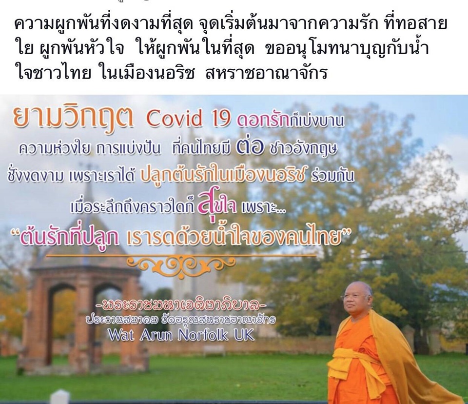 พระราชมหาเจติยาภิบาล ประธานสมาคมวัดอรุณสหราชอาณาจักร เปิดเผยว่า คณะสงฆ์วัดอรุณสหราชอาณาจักร พร้อมด้วยคณะกรรมการสมาคม คณะศิษยานุศิษย์ ร้านอาหารไทย ในมณฑลนอร์เฟิก เมืองนอริช ประเทศอังกฤษเเละญาติโยมผู้มีจิตอันเป็นกุศล ได้ร่วมกันจัดทำอาหารกล่อง เพื่อส่งมอบให้กับโรงพยาบาลในเมืองนอริช NHS Norfolk and Norwich University Hospitals เพื่อเป็นส่วนหนึ่งในการส่งกำลังใจ บุคลากรทางการแพทย์ เเละเจ้าหน้าที่ ปฏิบัติงานสู้กับไวรัสโควิด-19 ซึ่งประเทศอังกฤษเป็นหนึ่งในประเทศที่มีผู้ป่วยโควิด-19 เป็นจำนวนมาก
