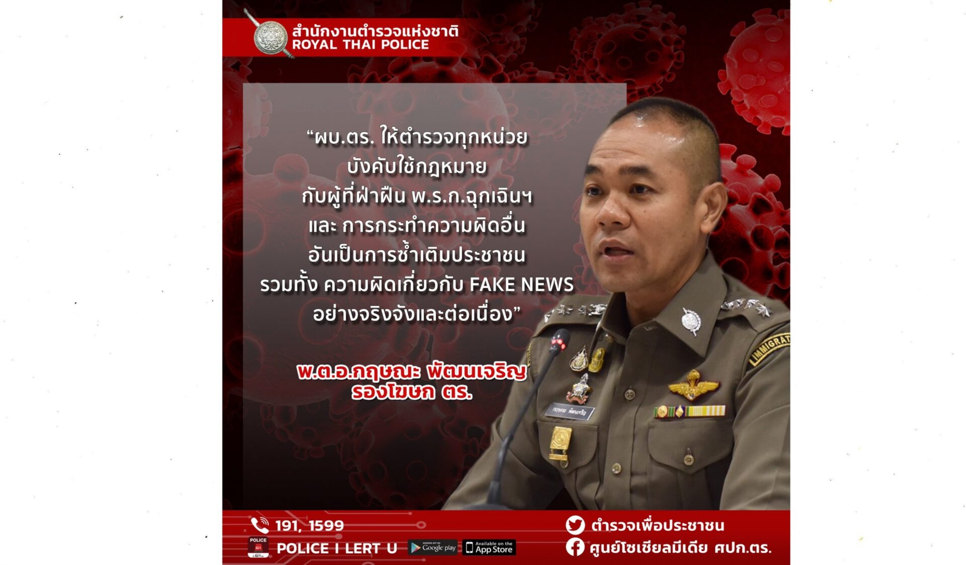 พ.ต.อ.กฤษณะ พัฒนเจริญ รอง โฆษก ตร. เปิดเผยถึงการบังคับใช้กฎหมาย ในห้วงที่มีการประกาศสถานการณ์ฉุกเฉินในทุกเขตท้องที่ทั่วราชอาณาจักร เนื่องจากมีการแพร่ระบาดของโรคติดเชื้อไวรัสโคโรนา 2019 หรือ โควิด 19 ว่า พล.ต.อ.จักรทิพย์ ชัยจินดา ผบ.ตร. ให้ตำรวจทุกหน่วย บังคับใช้กฎหมายกับผู้ที่ฝ่าฝืน พ.ร.ก.ฉุกเฉินฯ และ การกระทำความผิดอื่น อันเป็นการซ้ำเติมประชาชน รวมทั้ง ความผิดเกี่ยวกับ Fake News อย่างจริงจังและต่อเนื่อง .-สำนักข่าวไทย