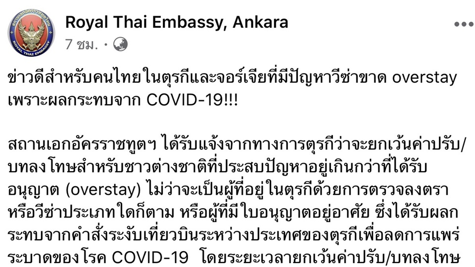 สถานเอกอัครราชทูต ณ กรุงอังการา โพสต์ข้อความผ่านทางเฟซบุ๊ก ระบุข้อความว่า ได้รับแจ้งจากทางการตุรกีว่าจะยกเว้นค่าปรับ บทลงโทษสำหรับชาวต่างชาติที่ประสบปัญหาอยู่เกินกว่าที่ได้รับอนุญาต (overstay) ไม่ว่าจะเป็นผู้ที่อยู่ในตุรกีด้วยการตรวจลงตรา หรือวีซ่าประเภทใดก็ตาม หรือผู้ที่มีใบอนุญาตอยู่อาศัย ซึ่งได้รับผลกระทบจากคำสั่งระงับเที่ยวบินระหว่างประเทศของตุรกี เพื่อลดการแพร่ระบาดของโรค COVID-19 โดยระยะเวลายกเว้นค่าปรับ บทลงโทษดังกล่าวจะครอบคลุม ตั้งแต่วันที่คำสั่งระงับเที่ยวบินมีผลบังคับใช้ (28 มีนาคม 2563) ไปจนถึงวันที่มีการยกเลิกคำสั่งดังกล่าวและสายการบินระหว่างประเทศกลับมาทำการบินได้ตามปกติ
