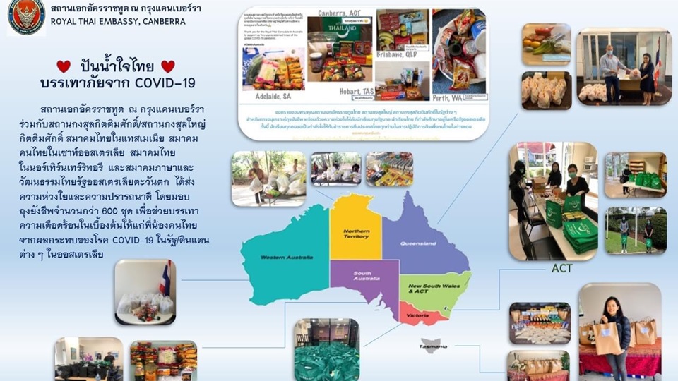 กระทรวงการต่างประเทศ โพสต์ข้อความผ่านทางเฟซบุ๊ก ระบุข้อความว่า สถานเอกอัครราชทูต ณ กรุงแคนเบอร์รา ร่วมกับสถานกงสุลกิตติมศักดิ์/สถานกงสุลใหญ่กิตติมศักดิ์ สมาคมไทยในแทสเมเนีย สมาคมคนไทยในเซาท์ออสเตรเลีย สมาคมไทยในนอร์เทิร์นเทร์ริทอรี และสมาคมภาษาและวัฒนธรรมไทยรัฐออสเตรเลียตะวันตก ได้ส่งความห่วงใยและความปรารถนาดี โดยมอบถุงยังชีพจำนวนกว่า 600 ชุด เพื่อช่วยบรรเทาความเดือดร้อนในเบื้องต้นให้แก่คนไทยจากผลกระทบการแพร่ระบาดของโรคติดเชื้อไวรัสโคโรนา 2019 (โควิด-19) ในรัฐ/ดินแดนต่าง ๆ ในออสเตรเลีย