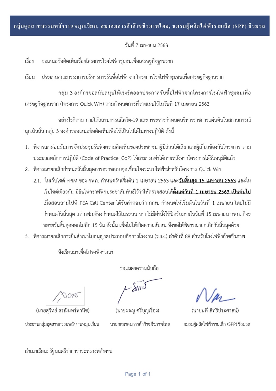 สมาคมการค้าก๊าซชีวภาพไทย ชมรมผู้ผลิตไฟฟ้ารายเล็ก (เอสพีพี) ชีวมวล และกลุ่มอุตสาหกรรมพลังงานหมุนเวียน ได้ทำหนังสือเมื่อวันที่ 7 เมษายน 2563 ถึงนายกุลิศ สมบัติสมศิริ ปลัดกระทรวงพลังงาน ในฐานะประธานคณะกรรมการบริหารการรับซื้อไฟฟ้าจากโครงการโรงไฟฟ้าชุมชนเพื่อเศรษฐกิจฐานราก หรือ โรงไฟฟ้าชุมชน โดยระบุว่ากลุ่ม 3 องค์กรสนับสนุนให้เร่งรัดออกประกาศรับซื้อไฟฟ้าจากโครงการโรงไฟฟ้าชุมชนเพื่อเศรษฐกิจฐานราก (โครงการ Quck Win) ตามกำหนดการที่วางแผนไว้วันที่ 17 เมษายน 2563