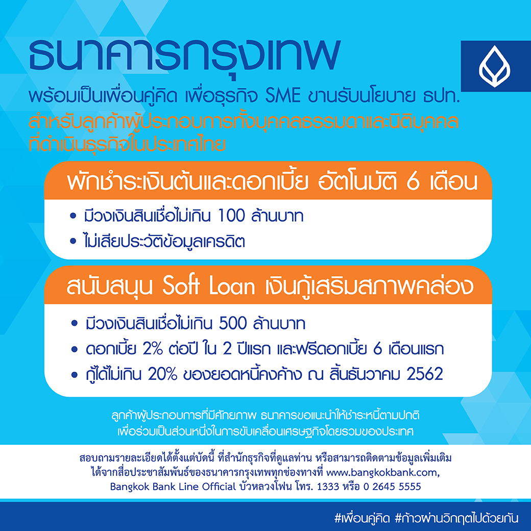 นายสุวรรณ แทนสถิตย์ กรรมการรองผู้จัดการใหญ่ ธนาคารกรุงเทพ จำกัด (มหาชน) เปิดเผยว่า ธนาคารกรุงเทพพร้อมเป็นส่วนหนึ่งในการดูแลและให้ความช่วยเหลือลูกค้าผู้ประกอบการเอสเอ็มอี ซึ่งเป็นภาคส่วนที่มีความสำคัญต่อเศรษฐกิจไทยและเป็นแหล่งการจ้างงานหลักของประเทศ โดยธนาคารให้การสนับสนุนมาตรการเพิ่มเติมของธนาคารแห่งประเทศไทย (ธปท.) เพื่อช่วยลูกค้าผู้ประกอบการให้มีเงินทุนและสภาพคล่องเพียงพอในการดำเนินธุรกิจและรักษาการจ้างงานต่อไป