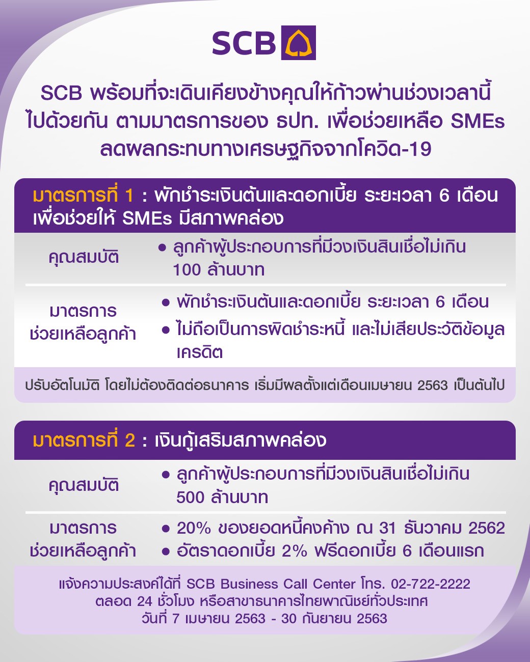 นายอาทิตย์ นันทวิทยา ประธานเจ้าหน้าที่บริหาร และประธานกรรมการบริหาร ธนาคารไทยพาณิชย์ กล่าวว่า ผลกระทบจากการแพร่ระบาดของโควิด-19 ได้กระจายความรุนแรงไปสู่ทุกภาคธุรกิจ ธนาคารพยายามแสวงหาแนวทางให้ความช่วยเหลือเพื่อเยียวยาและประคับประคองให้ลูกค้าเอสเอ็มอีของธนาคารทุกรายสามารถดำเนินธุรกิจต่อไปอย่างดีที่สุด และครั้งนี้เป็นอีกครั้งหนึ่งที่ธนาคารพร้อมตอบสนองมาตรการจากภาครัฐในทันที ด้วยมาตรการพักชำระสินเชื่อทั้งเงินต้นและดอกเบี้ยเป็นระยะเวลา 6 เดือน ให้แก่ลูกค้าธุรกิจเอสเอ็มอีที่มีวงเงินสินเชื่อไม่เกิน 100 ล้านบาททุกราย โดยธนาคารจะดำเนินการพักหนี้ให้ลูกค้ากลุ่มนี้ตั้งแต่เดือนเมษายน 2563 เป็นต้นไป เพื่อเป็นการช่วยแบ่งเบาภาระทางด้านค่าใช้จ่ายให้กับผู้ประกอบการได้อีกทางหนึ่ง