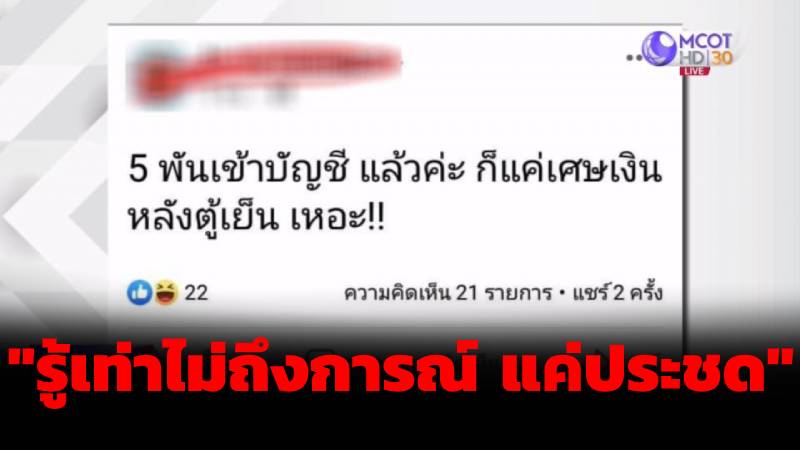 กทม. 8 เม.ย. – สาวไลฟ์สไตล์หรู โพสต์ได้รับสิทธิเราไม่ทิ้งกัน ได้เงินเยียวยา 5,000 แค่เศษเงิน ล่าสุดขอโทษแล้ว อ้างรู้เท่าไม่ถึงการณ์ แค่ต้องการประชด