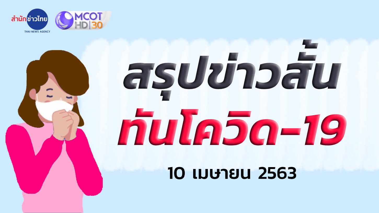 สำนักข่าวไทย 10 เม.ย. 63 – สรุปข่าวสั้นทันโควิด-19 วันนี้ (10 เม.ย. 63) ไทยติดเชื้อเพิ่ม 50 ราย เสียชีวิตอีก 1 ราย กลุ่มวัยรุ่น-คนทำงานติดเชื้อมากที่สุด