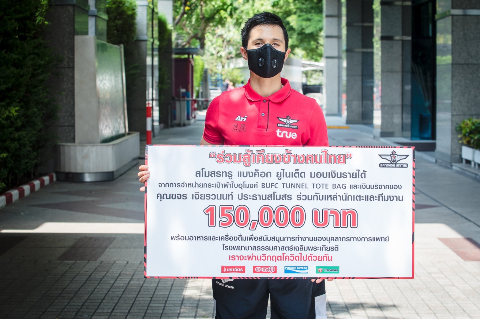 บาท ซึ่งเป็นรายได้จากการจำหน่ายกระเป๋าผ้าใบอุโมงค์ BUFC TUNNEL TOTE BAG และเงินบริจาคของ