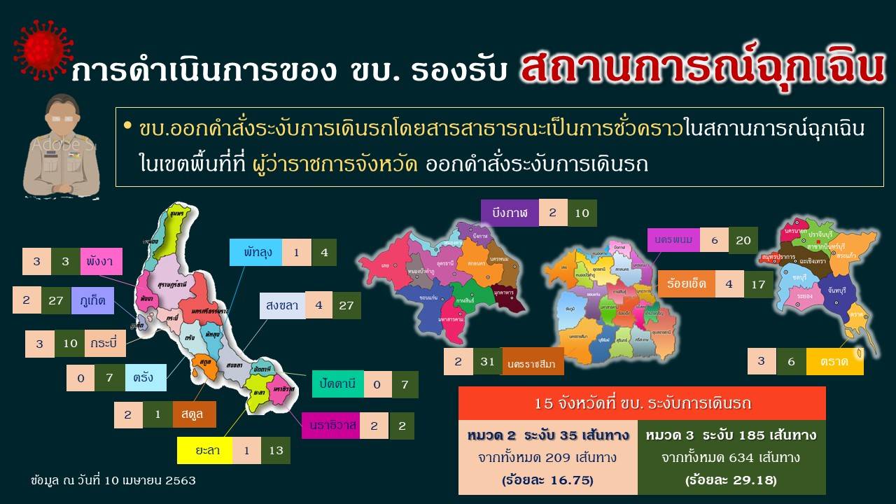 รวมทั้งล่าสุด นายกรัฐมนตรีมีคำสั่ง เมื่อวันที่ 8 เมษายน 63แต่งตั้งปลัดกระทรวงคมนาคมเป็นหัวหน้าผู้รับผิดชอบในการแก้ไขสถานการณ์ฉุกเฉินในส่วนที่เกี่ยวกับการคมนาคม และการขนส่งทั่วราชอาณาจักร อธิบดีกรมการขนส่งทางบกโดยความเห็นชอบของปลัดกระทรวงคมนาคม จึงมีคำสั่ง ให้ผู้ได้รับใบอนุญาตประกอบการขนส่งประจำทาง ด้วยรถที่ใช้ในการขนส่งผู้โดยสารระงับการเดินรถในเส้นทางหมวด 2และหมวด 3 ได้