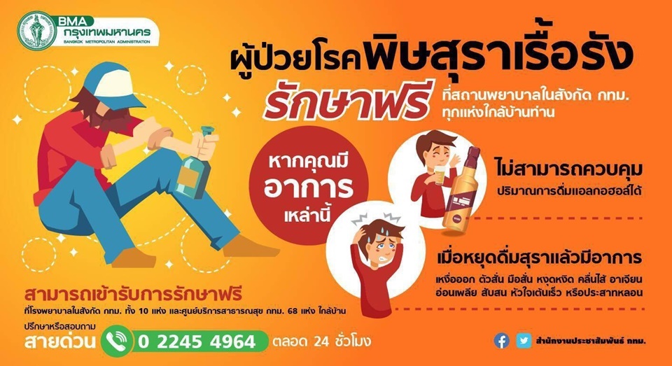 กทม.มีความห่วงใยในสุขภาพประชาชน โดยแนะนำให้ผู้ป่วยโรคพิษสุราเรื้อรังที่ไม่สามารถควบคุมปริมาณการดื่มแอลกอฮอล์ได้ หรือเมื่อหยุดดื่มแอลกอฮอล์แล้วจะมีอาการเหงื่อออก ตัวสั่น มือสั่น หงุดหงิด คลื่นไส้ อาเจียน อ่อนเพลีย สับสน หัวใจเต้นเร็ว หรือประสาทหลอน สามารถเข้ารับการรักษาได้ฟรีที่โรงพยาบาลในสังกัด กทม.ทั้ง10แห่ง และศูนย์บริการสาธารณสุขกทม.ทั้ง 68 แห่งหรือขอคำปรึกษาหรือสอบถามเพิ่มเติมได้ที่ศูนย์สายด่วน โทร. 0 2-245-4964 ตลอด 24 ชั่วโมง .-สำนักข่าวไทย