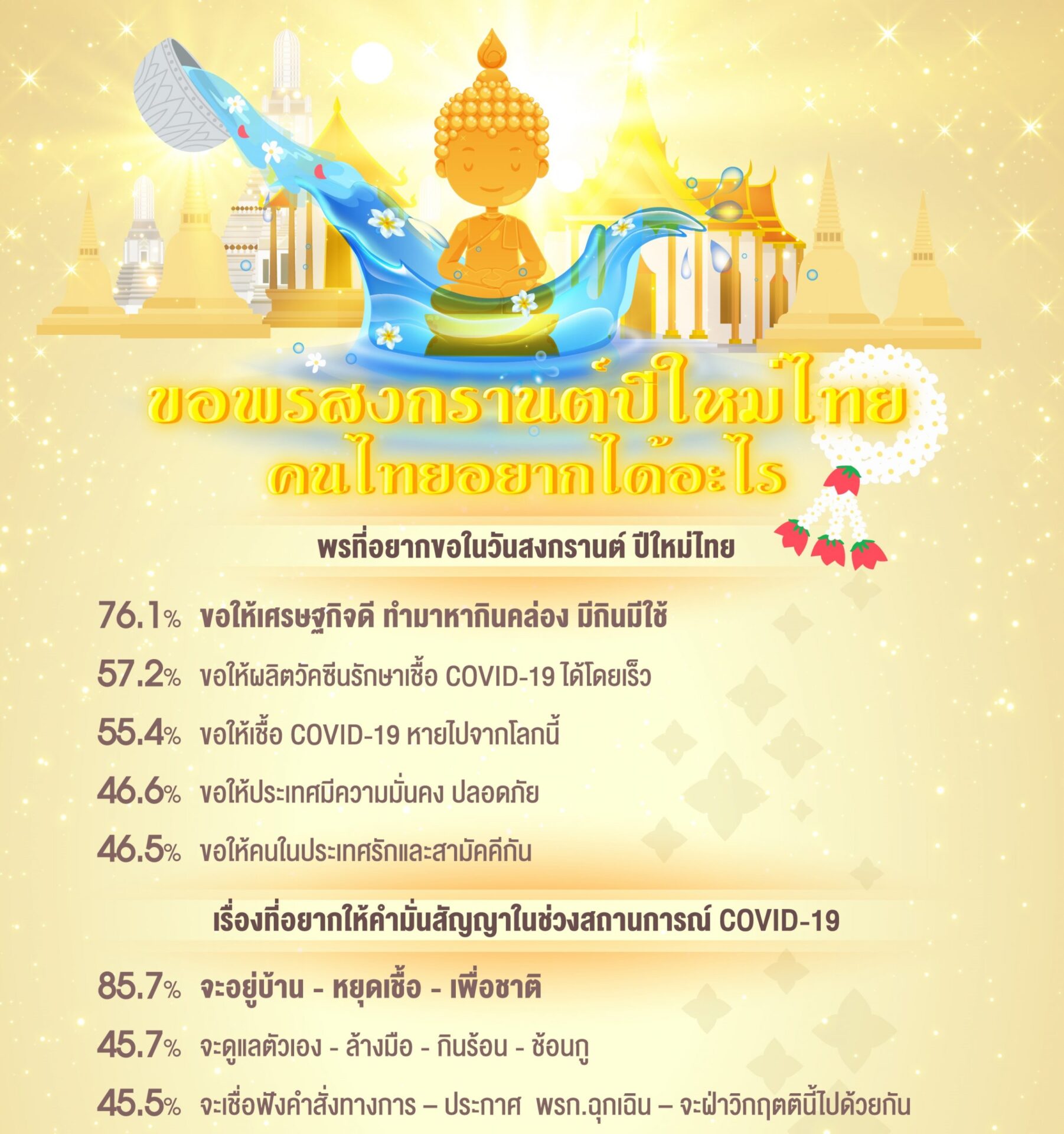 กรุงเทพโพลล์โดยศูนย์วิจัยมหาวิทยาลัยกรุงเทพ ดำเนินการสำรวจความคิดเห็นประชาชน เรื่อง “ขอพรสงกรานต์ปีใหม่ไทย คนไทยอยากได้อะไร” โดยเก็บข้อมูลกับประชาชนจากทุกภูมิภาคทั่วประเทศพบว่า พรที่ประชาชนอยากขอมากที่สุดในวันสงกรานต์ ปีใหม่ไทยคือ ขอให้เศรษฐกิจดี ทำมาหากินคล่อง มีกินมีใช้ คิดเป็นร้อยละ 76.1 รองลงมาคือ ขอให้ผลิตวัคซีนรักษาเชื้อ covid-19 ได้โดยเร็วคิดเป็นร้อยละ 57.2 ขอให้เชื้อ covid-19 หายไปจากโลกนี้คิดเป็นร้อยละ 55.4 ขอให้ประเทศมีความมั่นคง ปลอดภัยคิดเป็นร้อยละ 46.6 และขอให้คนในประเทศรักและสามัคคีกัน คิดเป็นร้อยละ 46.5