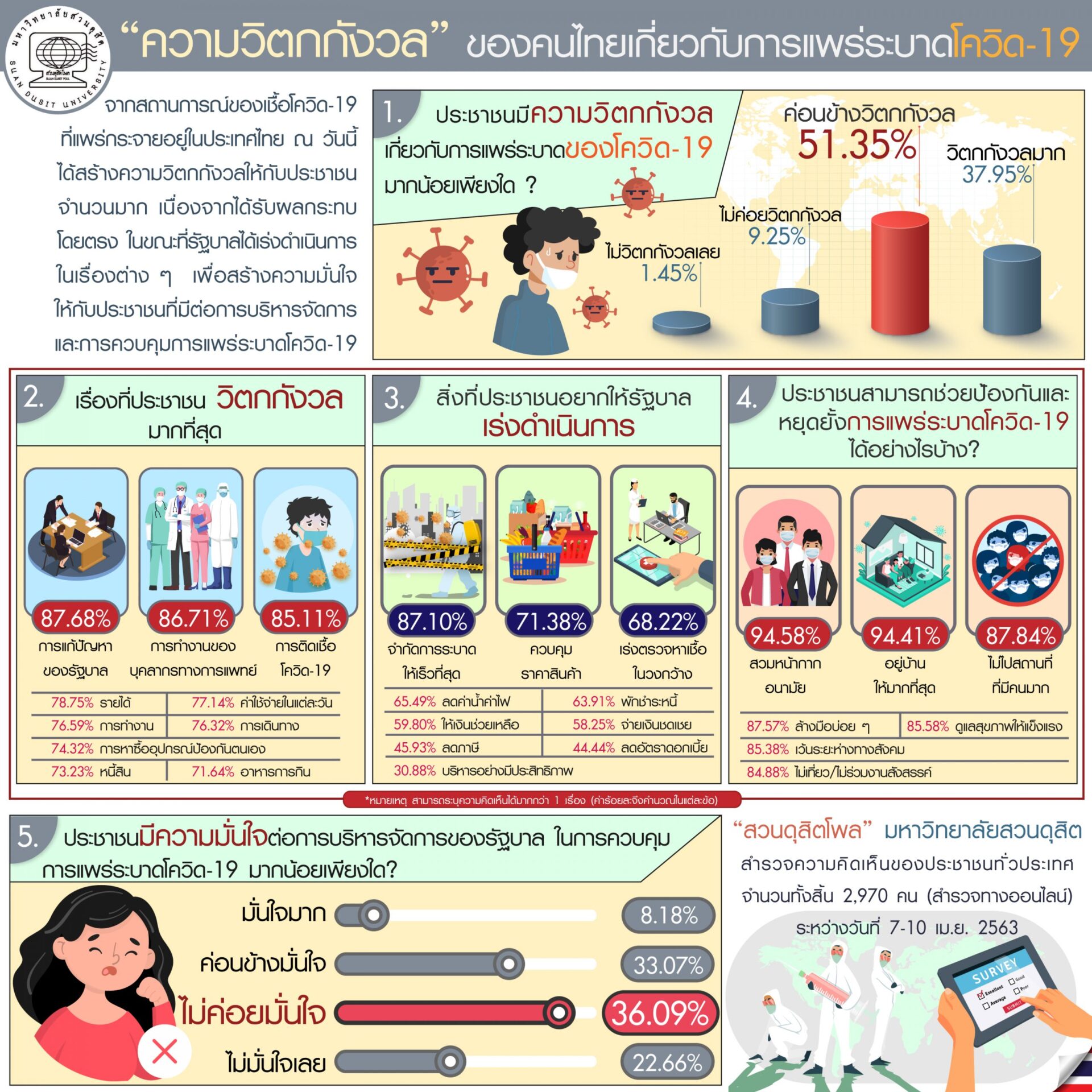 กรุงเทพฯ12 เม.ย..-สวนดุสิตโพล ได้สำรวจความคิดเห็นของประชาชนทั่วประเทศ จำนวนทั้งสิ้น 2,970 คน จากสถานการณ์ของเชื้อโควิด-19 ที่ ได้สร้างความวิตกกังวลให้กับประชาชนจำนวนมาก เนื่องจากได้รับผลกระทบโดยตรง สรุปผลได้ ดังนี้