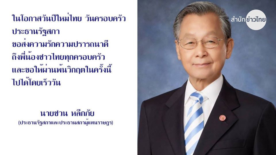 รัฐสภา 13 เม.ย.-  นายช่วน หลีกภัย ประธานรัฐสภาและประธานสภาผู้แทนราษฎร ส่งสารอวยพรคนไทยทุกคน ว่า “ในโอกาสวันปีใหม่ไทย และวันครอบครัว  ประธานรัฐสภาขอส่งความรักความปรารถนาดี ถึงพี่น้องชาวไทยทุกครอบครัว และขอให้ผ่านพ้นวิกฤตในครั้งนี้ไปได้โดยเร็ววัน” .- สำนักข่าวไทย