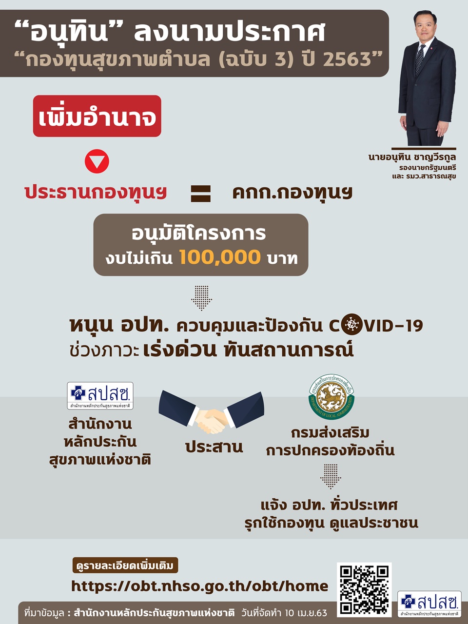 นพ.ศักดิ์ชัย กาญจนวัฒนา เลขาธิการสำนักงานหลักประกันสุขภาพแห่งชาติ (สปสช.) กล่าวว่า เมื่อวันที่ 31 มี.ค.63 นายอนุทิน ชาญวีรกูล รองนายกรัฐมนตรี และรัฐมนตรีว่าการกระทรวงสาธารณสุข ได้ลงนามประกาศคณะกรรมการหลักประกันสุขภาพแห่งชาติ เรื่อง หลักเกณฑ์เพื่อสนับสนุนให้องค์กรปกครองส่วนท้องถิ่นดำเนินงานและบริหารจัดการระบบหลักประกันสุขภาพในระดับท้องถิ่นหรือพื้นที่ (ฉบับที่ 3) พ.ศ.2563 โดยเพิ่มเติมข้อความที่ให้อำนาจ “ประธานกรรมการกองทุนหลักประกันสุขภาพในระดับท้องถิ่นหรือพื้นที่” ในการอนุมัติโครงการหรือกิจกรรมเพื่อป้องกันและแก้ไขปัญหาสาธารณสุขกรณีเกิดการระบาดของโรคติดต่ออันตรายตามกฎหมายว่าด้วยโรคติดต่อได้ตามความจำเป็นไม่เกิน 100,000 บาทต่อโครงการ โดยให้ถือว่าเป็นโครงการหรือกิจกรรมที่คณะกรรมการกองทุนอนุมัติ