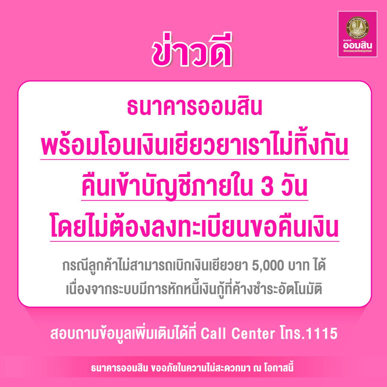 เนื่องจากขณะนี้ ธนาคารออมสินได้รับรายชื่อลูกค้ากลุ่มดังกล่าวจากกระทรวงการคลังเรียบร้อยแล้ว ซึ่งธนาคารฯ เร่งโอนเงินกลับเข้าบัญชีลูกค้าได้ภายใน 3 วัน โดยลูกค้าไม่ต้องลงทะเบียนใดๆ ทั้งสิ้น ซึ่งต้องขอขอบคุณกระทรวงการคลังที่เร่งรวบรวมและนำส่งบัญชีรายชื่อลูกค้ากลุ่มนี้มายังธนาคารออมสินได้อย่างรวดเร็ว