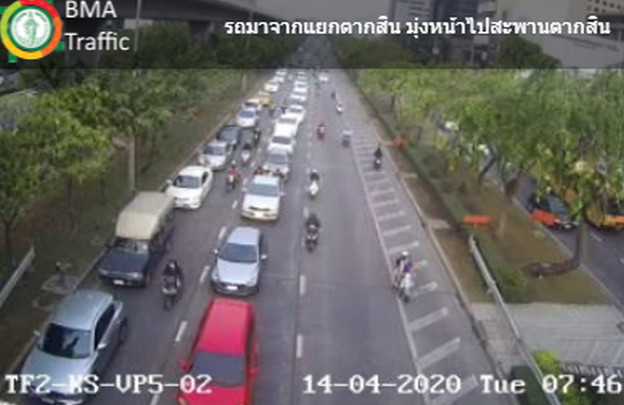 กทม. 14 เม.ย.-สวพ.FM91 รายงานจราจรเช้าวันอังคาร ถนนกรุงธนบุรี ขาเข้า ข้ามสะพานสมเด็จพระเจ้าตากสิน เข้าแยกสุรศักดิ์ – สาทร รถเริ่มมาก ท้ายแถวสะสมใต้บีทีเอส กรุงธนบุรี