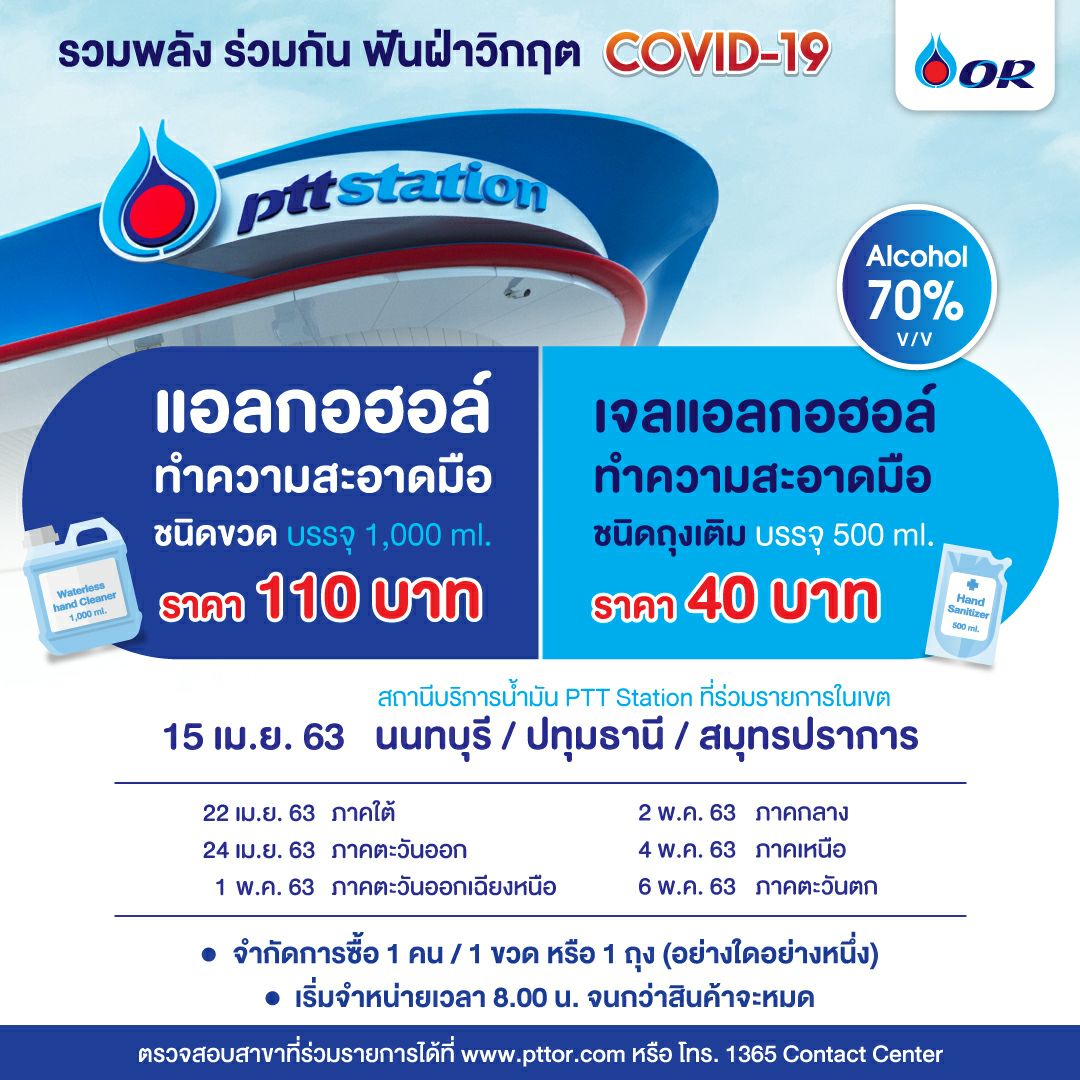 สถานีบริการน้ำมัน พีทีที สเตชั่น ปรับ แจ้งว่า ได้แผนการจำหน่ายแอลกอฮอล์ในราคาต้นทุนสำหรับทำความสะอาด ป้องกัน COVID-19 ให้แก่ผู้บริโภคในส่วนภูมิภาค เพื่อให้สามารถเข้าถึงผลิตภัณฑ์ทำความสะอาดและฆ่าเชื้อโรคได้ในหลากหลายพื้นที่ยิ่งขึ้น โดยเดิมวางแผนจะจำหน่ายเฉพาะแอลกอฮอล์ 70% ขนาด 1,000 มล. ราคา 110 บาท อย่างไรก็ตาม ได้จัดหาผลิตภัณฑ์เพิ่มเติม คือ เจลแอลกอฮอล์ ถุงละ 500 มล.จำหน่ายในราคาถุงละ 40 บาท แต่เพื่อให้เกิดการกระจายอย่างทั่วถึง จึงจำกัดการซื้อได้เพียงอย่างใดอย่างหนึ่ง 1 คน ต่อ 1 ขวด หรือ 1 คน ต่อ 1 ถุง เท่านั้น และผู้ซื้อต้องแสดงบัตรประจำตัวประชาชน / ใบขับขี่ / บัตรข้าราชการ หรือบัตรที่มีเลขประจำตัวประชาชน พร้อมกรอกข้อมูลในแบบฟอร์มก่อนซื้อ รวมทั้งต้องใส่หน้ากากและเว้นระยะห่างในการต่อแถวรอซื้ออย่างน้อย 1 เมตร