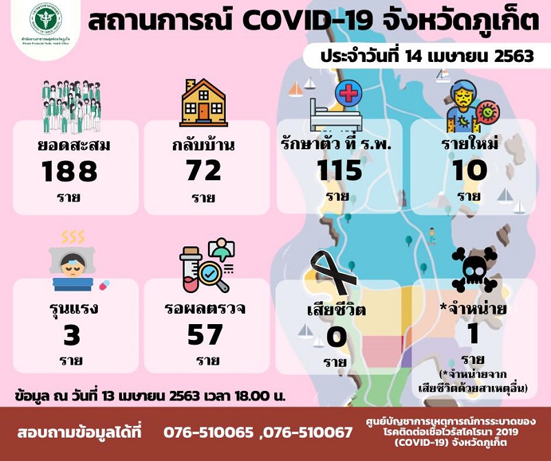วันนี้ (14 เม.ย.) คณะกรรมการโรคติดต่อจังหวัดภูเก็ต รายงานสถานการณ์โรคติดเชื้อไวรัสโควิด-19 ตั้งแต่วันที่ 5 ม.ค. – 13 เม.ย.2563 จังหวัดภูเก็ตมีผู้ป่วยยืนยันโรคโควิด-19 แล้ว 188 ราย รักษาหายกลับบ้านแล้ว 72 ราย (เสียชีวิต 1 ราย จากอุบัติเหตุอื่น) อยู่ระหว่างรักษา 115 ราย ในจำนวนนี้อาการรุนแรง 3 ราย นอกนั้นอาการอยู่ในเกณฑ์ดี และรอผลการตรวจทางห้องปฏิบัติการ 57 ราย