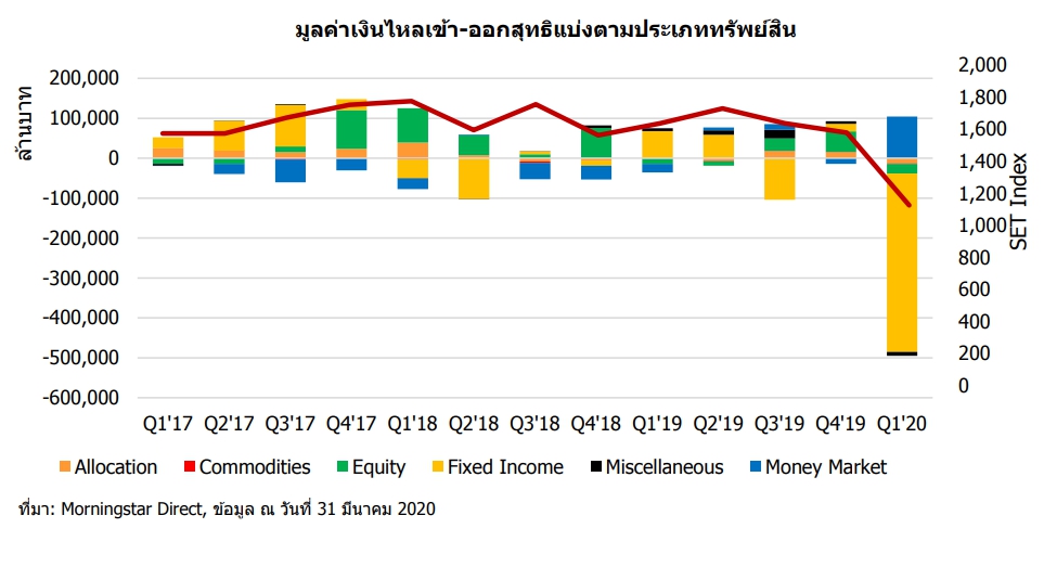 บริษัท มอร์นิ่งสตาร์ รีเสิร์ช (ประเทศไทย) สรุปภาพรวมกองทุนรวมไตรมาส 1 ปี 2563 ระบุว่าอุตสาหกรรมกองทุนรวมไทยมีมูลค่าทรัพย์สินสุทธิ ณ สิ้นเดือนมีนาคม ที่ 4.6 ล้านล้านบาท ลดลง 15.3% จากสิ้นปี 2562 มีเงินไหลออกสุทธิ 390,000 ล้านบาท โดยเป็นเงินไหลออกจากกองทุนรวมตราสารหนี้สูงเป็นประวัติการณ์ถึง 450,000 ล้านบาท กลุ่มตราสารทุนมีเงินไหลออกสุทธิ 24,000 ล้านบาท รวมถึงกลุ่มกองทุนผสม และกลุ่ม Commodities ก็มีเงินไหลออกสุทธิเช่นกัน ในขณะที่มีเพียงกลุ่มตราสารตลาดเงินที่มีเงินไหลเข้าสุทธิ 100,000 ล้านบาท
