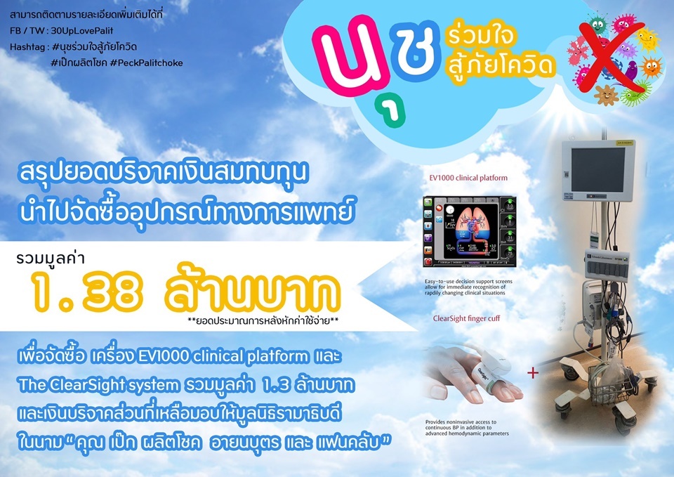 แฟนคลับ “เป๊ก” ผลิตโชค โพสต์ข้อความทางทวิตเตอร์ @30upLovePalit สรุปยอดบริจาค หลังหักค่าใช้จ่าย เพื่อซื้ออุปกรณ์การแพทย์ให้มูลนิธิรามาธิบดี เนื่องในสถานการณ์โควิด-19 ในนามเป๊ก ผลิตโชค และแฟนคลับ รวมแล้วเป็นจำนวน 1.38 ล้านบาท ขอบคุณทุกคนที่ร่วมทำบุญ วันที่ส่งมอบจะมาแจ้งอีกครั้ง #เป๊ก ผลิตโชค #นุชร่วมใจสู้ภัยโควิด