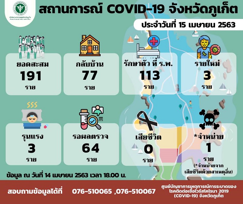 ภูเก็ต 15 เม.ย.- โควิด-19 ภูเก็ต ยอดป่วยสะสม 191 ราย รักษาหายกลับบ้านแล้วเพิ่มขึ้น 77 ราย และพบผู้ป่วยรายใหม่ 3 ราย
