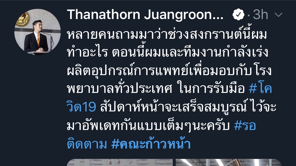 นายธนาธร จึงรุ่งเรืองกิจ โพสต์ข้อความผ่านทวิตเตอร์พร้อมภาพ ว่า หลายคนถามมาว่าช่วงสงกรานต์นี้ ตนทำอะไร ขณะนี้ผมและทีมงานกำลังเร่งผลิตอุปกรณ์การแพทย์เพื่อมอบกับโรงพยาบาลทั่วประเทศ ในการรับมือ #โควิด19 สัปดาห์หน้าจะเสร็จสมบูรณ์ ไว้จะมาอัพเดทกันแบบเต็ม ๆ นะครับ#รอติดตาม#คณะก้าวหน้า.-สำนักข่าวไทย