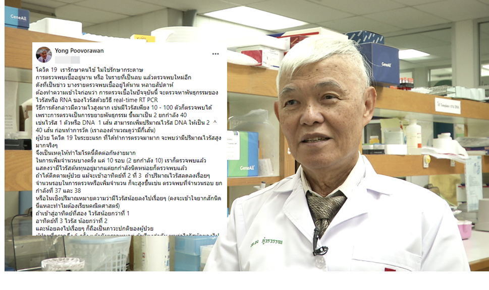 ศ.นพ.ยง ภู่วรวรรณ หัวหน้าศูนย์เชี่ยวชาญเฉพาะทาง ด้านไวรัสวิทยาคลินิก คณะแพทยศาสตร์ จุฬาลงกรณ์มหาวิทยาลัย และโรงพยาบาลจุฬาลงกรณ์ สภากาชาดไทย โพสต์เฟซบุ๊กส่วนตัว ว่า โควิด-19 เรารักษาคนไข้ ไม่ใช่รักษากระดาษ การตรวจพบเชื้ออยู่นาน หรือ ในรายที่เป็นลบ แล้วตรวจพบใหม่อีก ดังที่เป็นข่าว บางรายตรวจพบเชื้ออยู่ได้นาน หลายสัปดาห์ ต้องทำความเข้าใจก่อนว่า การตรวจเชื้อในปัจจุบันนี้ จะตรวจหาพันธุกรรมของไวรัสหรือ RNA ของไวรัสด้วยวิธี real-time RT PCR วิธีการดังกล่าวมีความไวสูงมาก เช่นมีไวรัสเพียง 10 – 100 ตัวก็ตรวจพบได้