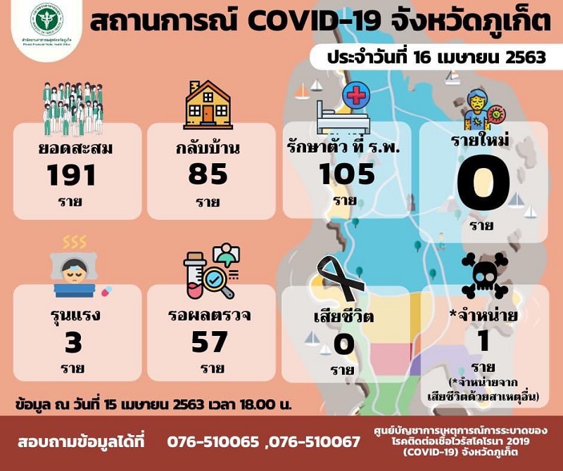 วันนี้ (16 เม.ย.) คณะกรรมการโรคติดต่อจังหวัดภูเก็ต รายงานสถานการณ์โควิด-19 ประจำวันที่ 16 เม.ย.2563 (ตั้งแต่ 5 ม.ค.– 15 เม.ย.) จังหวัดภูเก็ตไม่พบผู้ป่วยรายใหม่ หรือเป็นศูนย์ ยอดป่วยสะสม 191 ราย รักษาหายกลับบ้านแล้ว 85 ราย อยู่ระหว่างรักษา 105 ราย ในจำนวนนี้อาการรุนแรง 3 ราย นอกนั้นอาการอยู่ในเกณฑ์ดี และรอผลการตรวจทางห้องปฏิบัติการ 57 ราย
