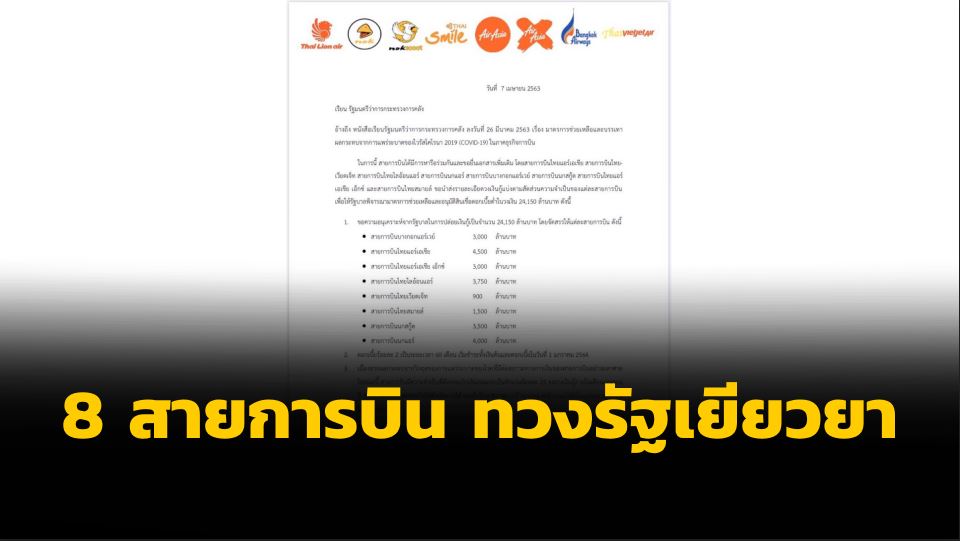 กรุงเทพฯ 16 เม.ย. – มาแล้วจร้า!! 8 สายการบินในประเทศ ทำหนังสือทวงรัฐ ขอความคืบหน้ามาตรการเยียวยา หาแหล่งกู้สินเชื่อดอกเบี้ยต่ำ (Soft loan) ต่อชีวิตสายการบิน 25,000 ล้านบาท