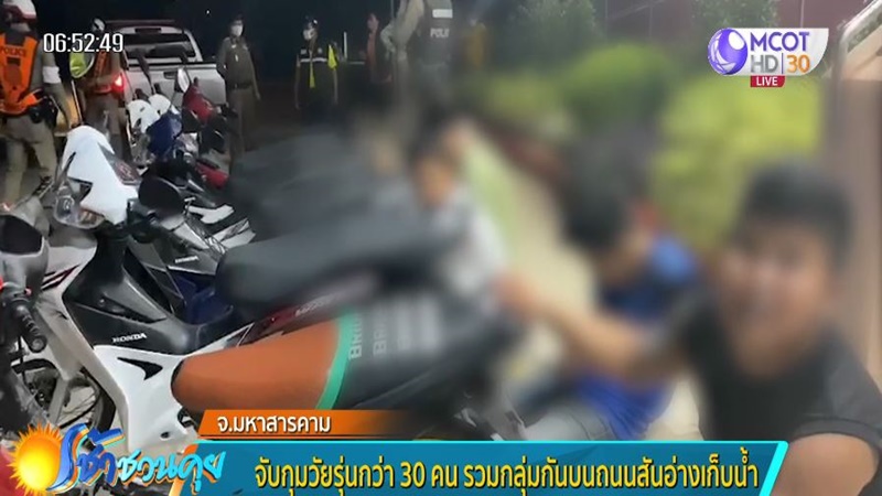 มหาสารคาม 17 เม.ย. – ตำรวจ สภ.โกสุมพิสัย บุกจับวัยรุ่นรวมกลุ่มกันบริเวณสันอ่างเก็บน้ำห้วยขอนสัก รวบตัวได้ 30 คน พร้อมรถจักรยานยนต์ ส่วนใหญ่เป็นเยาวชนอายุ 15-18 ปี สอบสวนยอมรับไม่มีที่เล่นน้ำสงกรานต์ จึงรับนัดกันมาจอดรถจักรยานยนต์สังสรรค์กัน ไม่มีเจตนาแข่งรถ