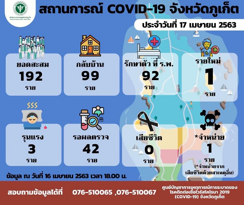 คณะกรรมการโรคติดต่อจังหวัดภูเก็ตรายงานสถานการณ์โรคติดเชื้อไวรัสโควิด-19 ประจำวันที่ 17 เม.ย.2563 มีผู้ติดเชื้อรายใหม่เพิ่ม 1 ราย ยอดป่วยสะสม 192 ราย ซึ่งผู้ติดเชื้อได้รับการรักษาหายและกลับบ้านเพิ่มขึ้น รวมแล้ว 99 ราย และอยู่ระหว่างการรักษาตัว 92 ราย ในจำนวนนี้อาการรุนแรง 3 ราย ที่เหลืออาการอยู่ในเกณฑ์ดี และอยู่ระหว่างรอผลการตรวจทางห้องปฏิบัติการ 42 ราย