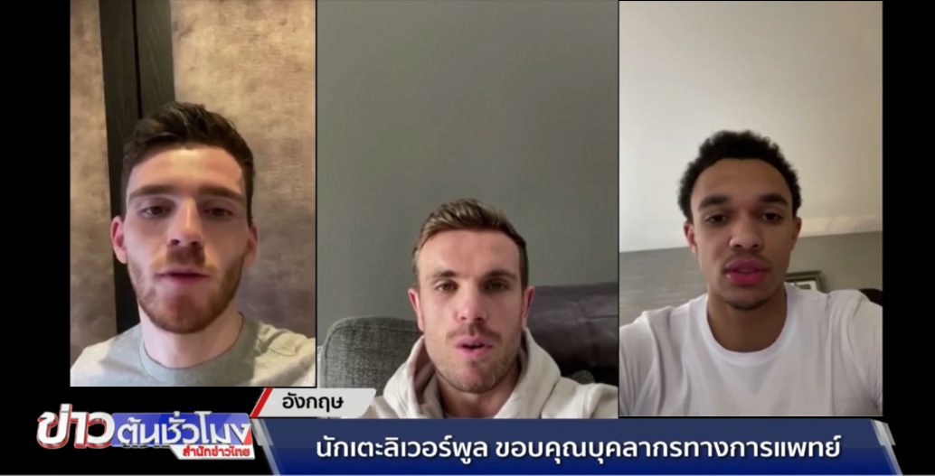 อังกฤษ 19 เม.ย.- แอนดรูว์ โรเบิร์ตสัน, จอร์แดน เฮนเดอร์สัน และเทรนต์ อเล็กซานเดอร์-อาร์โนลด์” 3 นักเตะลิเวอร์พูล ส่งคลิปขอบคุณเจ้าหน้าที่ด้านสาธารณสุขของอังกฤษ ที่ทำงานอย่างหนักเพื่อช่วยเหลือผู้ป่วยโควิด-19 โดยสโมสรลิเวอร์พูลยังส่งกระเช้าช็อกโกแลต 200 ชุด ไปยัง 14 โรงพยาบาลในเมือง เพื่อเป็นกำลังใจให้บุคลาการทางการแพทย์ด้วย