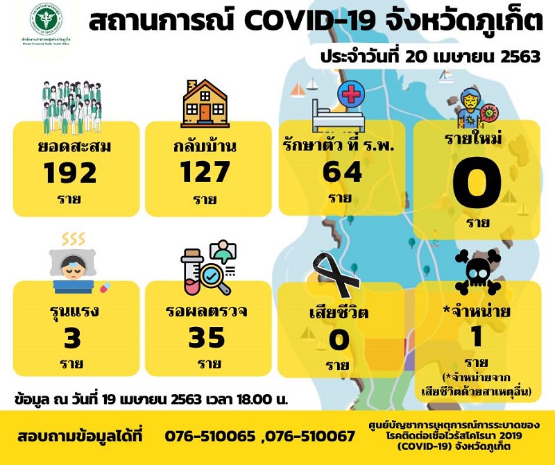 คณะกรรมการโรคติดต่อจังหวัดภูเก็ต รายงานสถานการณ์โรคติดเชื้อไวรัสโควิด-19 ประจำวันที่ 20 เม.ย.2563 มีจำนวนผู้ติดเชื้อสะสมคงที่ 192 ราย ไม่พบผู้ป่วยรายใหม่มาเป็นเวลา 3 วันแล้ว ขณะที่ตัวเลขผู้ติดเชื้อที่รักษาหายเพิ่มอีก 1 ราย รวมเป็น 127 ราย ยังรักษาอยู่ 64 ราย ในจำนวนนี้อาการรุนแรง 3 ราย นอกนั้นอาการอยู่ในเกณฑ์ดี และยังรอผลตรวจทางห้องปฏิบัติการ 35 ราย อย่างไรก็ตาม ถึงแม้ตัวเลขผู้ติดเชื้อของจังหวัดภูเก็ตจะลดลงเรื่อย ๆ ทางจังหวัดก็ยังคงดำเนินการตรวจคัดกรองประชาชนในพื้นที่มีความเสี่ยง โดยเฉพาะพื้นที่บ้านบางเทา ต.เชิงทะเล อ.ถลาง ซึ่งเป็นพื้นที่สุดท้ายในการค้นหาผู้สัมผัสความเสี่ยง และจากผลการดำเนินการตรวจคัดกรองประชาชนในพื้นที่เสี่ยงดังกล่าว เมื่อวันที่ 18 เม.ย.ที่ผ่านมา ในพื้นที่หมู่ 2 และ หมู่ 5 บ้านบางเทา ไปกว่า 4,000 ราย พบผู้เข้าเกณฑ์สอบสวนโรคเพียง 12 ราย