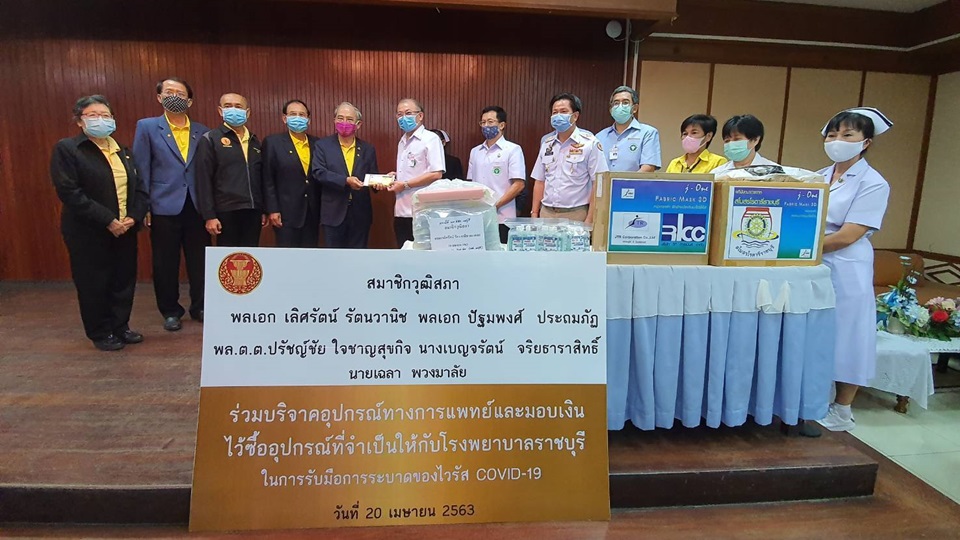 กรุงเทพฯ 20 เม.ย.-ผู้สื่อข่าวรายงานว่า สมาชิกวุฒิสภา ประกอบด้วย พล.อ.เลิศรัตน์ รัตนวานิช พร้อมด้วย พล.อ.ปัฐมพงศ์ ประถมภัฏ นางเบญจรัตน์ จริยธาราสิทธิ์ พล.ต.ต.ปรัชญ์ชัย ใจชาญสุขกิจ และนายเฉลา พวงมาลัย ร่วมมอบอุปกรณ์ทางการแพทย์มูลค่า 100,000 บาท พร้อมเงินบริจาค จำนวน 110,000 บาท ให้แก่ โรงพยาบาลราชบุรี และสำนักงานสาธารณสุขจังหวัดราชบุรี และมอบอุปกรณ์ทางการแพทย์มูลค่า 100,000 บาท พร้อมเงินบริจาค จำนวน 50,000 บาท ให้แก่ โรงพยาบาลบ้านโป่ง จังหวัดราชบุรี