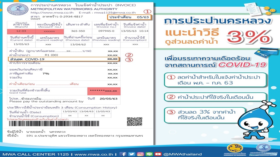การประปานครหลวง (กปน.) ลดค่าน้ำประปา 3 % เป็นระยะเวลา 3 เดือน ตามมาตรการบรรเทาความเดือดร้อนและแบ่งเบาภาระค่าใช้จ่ายของประชาชน ในช่วงการแพร่ระบาดของโรคติดเชื้อไวรัสโคโรนา (COVID – 19 ) ให้กับผู้ใช้น้ำทุกประเภท สำหรับใบแจ้งค่าน้ำประปาของเดือนพฤษภาคม มิถุนายน และกรกฎาคม 2563 ซึ่ง กปน.จะให้ส่วนลดค่าน้ำประปากับผู้ใช้น้ำทุกราย 3 % ทันที โดยไม่ต้องลงทะเบียนเพื่อรับสิทธิ์นี้ โดย กปน.จะแจ้งส่วนลดค่าน้ำประปา 3 % ในใบแจ้งค่าน้ำประปาของเดือนพฤษภาคม มิถุนายน และกรกฎาคม 2563 ซึ่งจะมีข้อความว่า “ส่วนลด (COVID-19)” ตามด้วยส่วนลดค่าน้ำประปาในเดือนนั้น ทั้งนี้ สามารถสอบถามข้อมูลเพิ่มเติมได้ที่ MWA call center โทร.1125 ตลอด 24 ชั่วโมง หรือ ทาง Line Official Account : @MWAthailand.-สำนักข่าวไทย