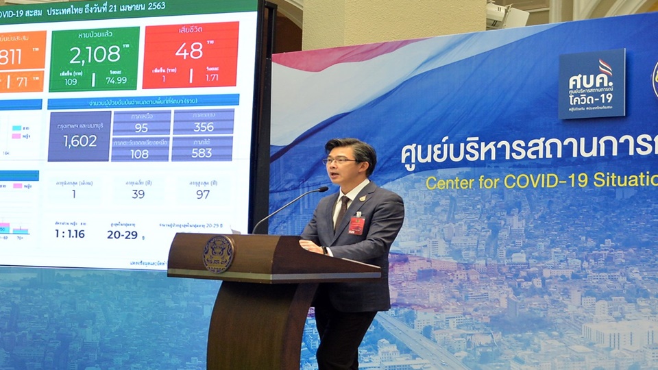 นพ.ทวีศิลป์ วิษณุโยธิน โฆษกศูนย์บริหารสถานการณ์การแพร่ระบาดของโรคติดเชื้อไวรัสโคโรนา 2019 (โควิด-19) หรือ ศบค. แถลงสถานการณ์โควิด-19 ว่า วันนี้ (21 เม.ย.) มีรายงานผู้ป่วยใหม่ 19 ราย รวมผู้ป่วยสะสมเพิ่มขึ้นเป็น 2,811 ราย รักษาหาย 2,108 ราย รักษาตัวอยู่ 655 ราย มีผู้เสียชีวิตเพิ่ม 1 ราย ทำให้มีผู้เสียชีวิต รวม 48 ราย โดย ผู้เสียชีวิตรายล่าสุดเป็นชายไทยอายุ 50 ปี อาชีพขับรถแท็กซี่ มีโรคประจำตัว คือเบาหวานชนิดที่สองที่ยังควบคุมระดับน้ำตาลได้ไม่ดีและสูบบุหรี่ ประวัติเสี่ยงคือรับ-ส่งผู้โดยสาร ไปดูมวยที่สนามมวยลุมพินี เริ่มป่วยเมื่อวันที่ 18 มีนาคมที่ผ่านมา ด้วยอาการหายใจลำบาก ไข้ต่ำ ๆ ไอ เข้ารับการตรวจที่โรงพยาบาลแห่งหนึ่งในกรุงเทพมหานคร และรับยากลับไปรับประทานที่บ้าน จากนั้นอาการไม่ดีขึ้น จึงเข้ารับการรักษาที่โรงพยาบาลอีกครั้งในวันที่ 23 มีนาคม ด้วยอาการไข้สูง 39.5 องศาเซลเซียส ปวดเมื่อยตามตัว หายใจลำบาก เสมหะเพิ่มขึ้น ตรวจยืนยันพบเชื้อโควิด-19 จากนั้นอาการแย่ลงและเสียชีวิตวานนี้(20 เม.ย.)
