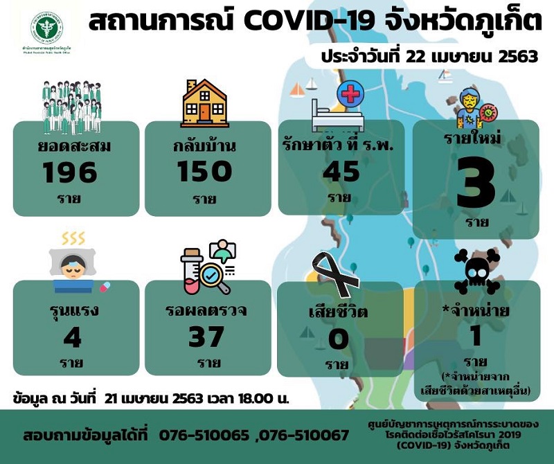 คณะกรรมการโรคติดต่อจังหวัดภูเก็ต รายงานสถานการณ์การแพร่ระบาดของโรคติดเชื้อไวรัสโคโรนา 2019 (โควิด-19) ประจำวันที่ 22 เม.ย.2563 ว่า ระยะนี้พบผู้ติดเชื้อจะน้อยกว่าผู้ป่วยที่รักษาหายแล้ว โดยมีผู้ติดเชื้อรายใหม่อีก 3 ราย ยอดสะสม 196 ราย รักษาหายเพิ่ม 17 ราย รวมเป็น 150 ราย ยังรักษาอยู่ 45 ราย ในจำนวนนี้ อาการรุนแรง 4 ราย ที่เหลืออาการอยู่ในเกณฑ์ดี และรอผลการตรวจทางห้องปฏิบัติการ 37 ราย