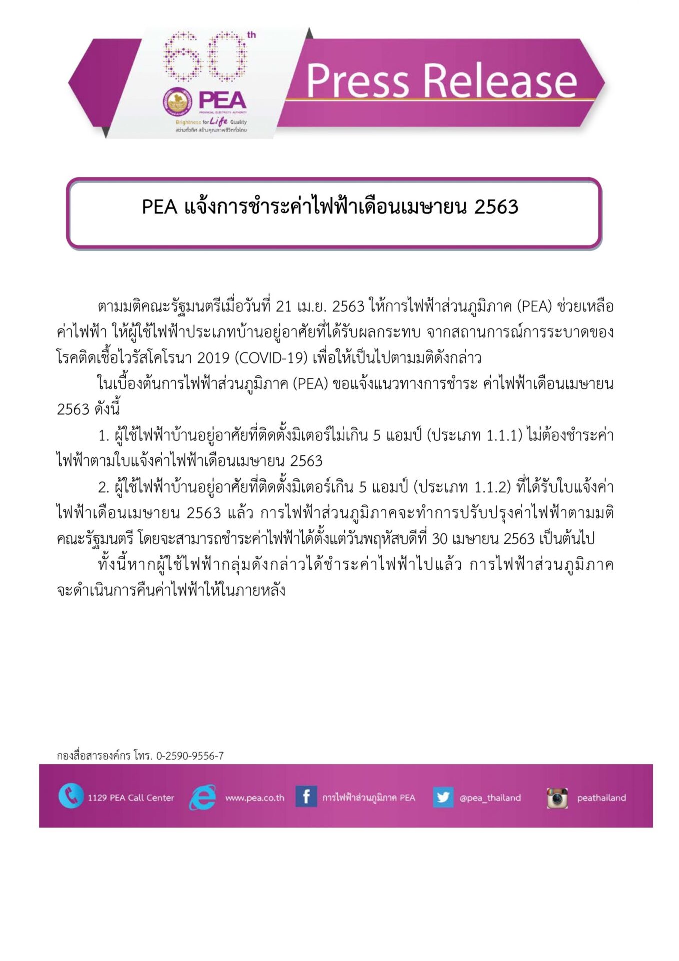 ตามมติคณะรัฐมนตรีเมื่อวันที่ 21 เม.ย. 2563 ให้การไฟฟ้าส่วนภูมิภาค (PEA) ช่วยเหลือค่าไฟฟ้า ให้ผู้ใช้ไฟฟ้าประเภทบ้านอยู่อาศัยที่ได้รับผลกระทบ จากสถานการณ์การระบาดของโรคติดเชื้อไวรัสโคโรนา 2019 (COVID-19) เพื่อให้เป็นไปตามมติดังกล่าว